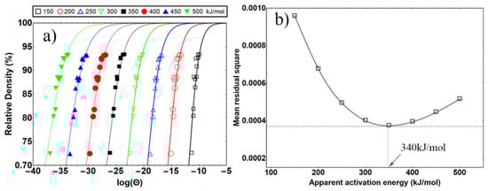Figure 3a displays the fitted curve on ρ vs. log(Θ). As shown in Figure 3a, the data obtained at different heating rates fit well with the curves at Q~300 and Q~400, indicating that the actual apparent activation energy of the samples is within 300–400 kJ/mol (3.125–4.17 eV/atom), which is well in accordance with the values of sintering apparent activation energy (in the range of 150–550 kJ/mol (1.56–5.73 eV/atom)) for refractory metals, according to previous studies [,,,].