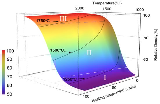 Based on the calculated QMSC, the prediction map of samples for various heating rates was built and is shown in Figure 4. As indicated in the 3D map, the densification process came to be more slowly at the same termination temperature with increased heating rate. Meanwhile, it can be seen that the map can be divided into three sections according to the temperature zone: the slowly increased density at low temperature (Area I), then the rapidly grown density with increased temperature (Area II), and densification significantly slowing down in the third section.