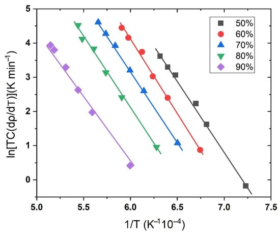 The Arrhenius plot of ln[TC(dρ/dT)] vs. (1/T) for the non-isothermal sintering of the powder compacts at different heating rates corresponding to the same relative density.