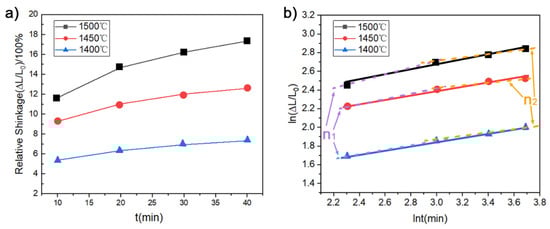 where ΔL/L0 is the relative shrinkage, A(T) is a constant related to the sintering temperature, t is the sintering time, and n is the sintering characteristic index. The atom migration mechanism in the sintering process can be determined according to the value of n.
