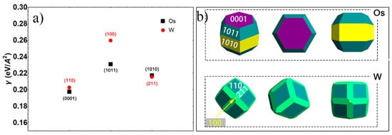 The surface energy of the typically exposed crystal plane of osmium and W is calculated with Equation (10), and the results are shown in Figure 7a.