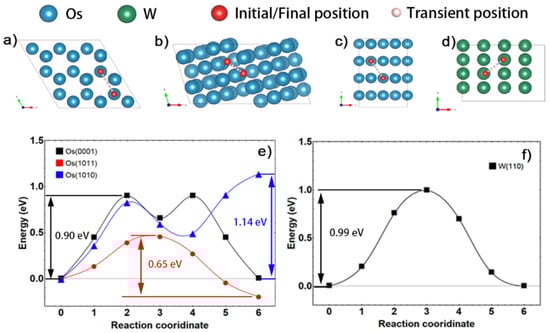 Models of surface atom migration of (a–c) Os on Os(0001)/(1010)/(1011) and (d) W on W(110), energy barriers of (e) Os on Os surface, (f) W on W(110).