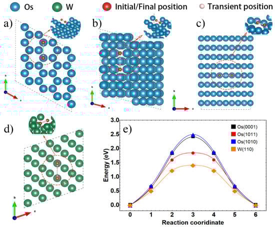 Models of surface vacancy migration of (a–c) Os on Os(0001)/(1010)/(1011) and (d) W on W(110), (e) the corresponding energy barriers.