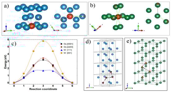 Inner vacancy migration of (a) Os with direction A <0001> and B<2203>, (b) W with direction A <001> and B<111>, (c) energy barriers, (d) path example of Os, and (e) path example of W.