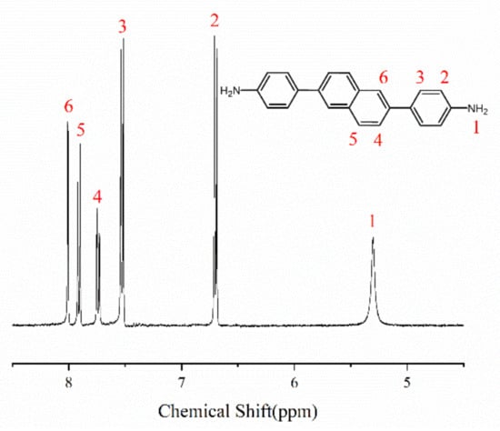 Under the protection of nitrogen, 2,6-dibromonaphthalene (2.86 g, 0.01 mol), 4-aminophenylboronic acid pinacol ester (6.56 g, 0.03 mol), tetrabutylammonium bromide (TBAB, 1.00 g, 10 wt%), catalyst tetrakis(triphenylphosphine)palladium [Pd(PPh3)4, 0.20 g, 2 wt%] were added to a 500 mL three-necked flask. After stirring for 10 min, add 60 mL of K2CO3 (2 mol/L), and stirring at 75–85 °C for 36 h. After the reaction, a deep green mixed solution is obtained, using 100–200 mesh neutral alumina as stationary phase and petroleum ether/ethyl acetate (2:3, v/v) as mobile phase, the solvent is removed after rotary evaporation, and the diamine monomer NADA yellow powder was obtained after vacuum drying 2.18 g, yield 70.32% and 95% purity. As shown in Figure 1, 1H NMR (400 MHz, DMSO-d6) δ 8.01 (d, J = 1.8 Hz, 2H), 7.91 (d, J = 8.6 Hz, 2H), 7.74 (dd, J = 8.5, 1.7 Hz, 2H), 7.57–7.49 (m, 4H), 6.73–6.66 (m, 4H), 5.30 (s, 4H).MS(m/z):311.15([M+H]+).