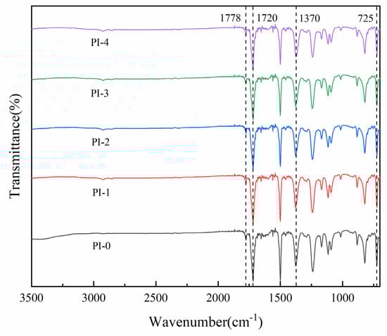 The chemical structure of PI was characterized using FT-IR spectroscopy, as shown in Figure 2. The five groups of PI films after thermal imidization showed obvious characteristic absorption peaks at 1778, 1720, 1370 and 725 cm−1, specifically near 1778 cm−1 (imide C=O asymmetric pair stretching vibration) and 1720 (imide C=O asymmetric pair stretching vibration) for the imide ring, and near 1370 cm−1 (stretching vibration of imide ring C-N), and near 725 cm−1 (bending vibration peak of imide C=O). In addition, no carboxyl group (-COOH), amide (-CO-NH-) or residual amino group (-NH-) appeared in the range of 3300–3500 cm−1. The characteristic absorption peaks indicate that the polyimide has been completely imidization.