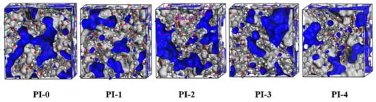 This experiment mainly investigates the dielectric properties of modified PI. Dk and Df decrease with increasing fractional free volume (FFV), so simulation calculations are performed for its FFV and provide partial theoretical support for PI performance. The FFV of the PMDA/ODA/NADA system polyimide at 300 K was calculated with the Atom Volume and Surface toolbar of MS, where the filled gray area in Figure 4 indicates the volume occupied by the polymer, and the filled blue area indicates the free volume. The total volume of PI molecular cells and the free volume of the system are calculated, and the free volume divided by the total volume to the free volume fraction of the system. As shown in Table 3, the introduction of the naphthalene ring structure makes the FFV of PI-1 decrease significantly, indicating that the biphenyl structure strengthens the intermolecular forces and makes the chain spacing narrower. The increase in FFV of PI-1 to PI-2 may be due to a certain amount of non-planar conjugated naphthalene ring structure, which plays a certain steric hindrance effect, and then influences the dense stacking of molecular chains. After which, as the naphthalene ring increases, the π–π stacking plays a dominant role in making the FFV decrease continuously.