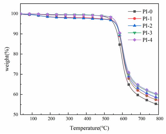 The thermal stability of the polymer films was studied by thermogravimetric analysis (TGA), and the TGA curves of PI films are shown in Figure 5. From Table 4, it can be seen that the thermal decomposition temperature (Td5%) of PI-0–PI-4 at 5% weight loss is in the range of 553–569 °C, the thermal decomposition temperature (Td10%) at 10% weight loss is in the range of 573–586 °C, and the residual mass fraction (Rw800) of the film at 800 °C is in the range of 50.01–60.06%. Its thermal stability also increases gradually with the increasing of the molar content of diamine monomer NADA, and the variation of Td5% is larger than that of Td10%. In addition, with the increasing of the content of aromatic ring in the PI molecular chain, Rw800 also appears to be significantly improved. Since NADA is a diamine monomer with a rigid structure, when its molar content increases it also increases the overall rigidity of its molecular chain, and the energy required to break the C-C bond in the biphenyl structure is higher than the energy required to break the ether bond in ODA, so the thermal decomposition temperature Td increases to some extent. In addition, we also found that the improvement of thermal stability of PI is more obvious with the amount of NADA around 5%, and then the improvement of thermal stability slows down significantly with the increase of NADA content.