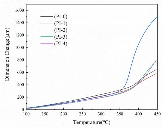 Numerous structural studies have shown that the coefficient of thermal expansion (CTE) tends to decrease with increasing in-plane orientation, and the degree of rigidity of the PI backbone will directly affect the in-plane orientation [23]. Therefore, the PMDA/ODA/NADA system PI was prepared by introducing a rigid naphthalene ring structure through copolymerization method to further reduce its CTE value. The dimensional stability of the films was determined by the TMA method and evaluated by the coefficient of thermal expansion (CTE). As shown in Figure 6, plotting the corresponding dimensional change–temperature curve of PI film, the CTE values were calculated from the slope of the curve from 100 °C to 200 °C (before Tg). As shown in Table 4, the CTE of PI films decreased from 50.01 ppm/K to 41.13 ppm/K as the molar content of NADA monomer increased, which may be due to the rigid structure of the PI backbone that makes it easier for the spontaneous in-plane orientation of its molecular chains, resulting in a reduction in molecular chain spacing and more of a tendency for dense stacking, which eventually caused the lower CTE values of PI films. This is in agreement with the above XRD test analysis.