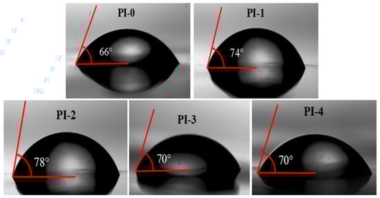 Hydrophobicity is critical to the reliability of devices in use, especially in microelectronics. Therefore, water contact angle and water absorption tests were used, and surface hydrophobicity was characterized by the contact angle of water droplets on PI films surface, which is shown in Figure 7. As the content of NADA monomer increases, the water contact angle of PI-0 increases from 66° to 78° for PI-2. It is noteworthy that when the content of NADA monomer reaches 15%, the contact angle of PI-3 decreases to 70° instead, and the contact angle size of the subsequent PI-4 does not change significantly, but is still larger than that of PI-0. In addition, the water absorption test in Table 6 also indirectly proves that PI-1–PI-4 have good hydrophobicity, and their overall water absorption decreases between 0.17% and 0.34% compared to the control PI-0, where PI-2 shows a relatively lower water absorption of 0.91%. This is due to the fact that the ether bond in ODA acts as a donor of electrons and forms stable hydrogen bonds with hydrogen in water [25]. With the reduction of the hydrophilic group ether bond and the introduction of the non-polar group naphthalene ring effectively improves the surface hydrophobicity of PMDA/ODA membranes.