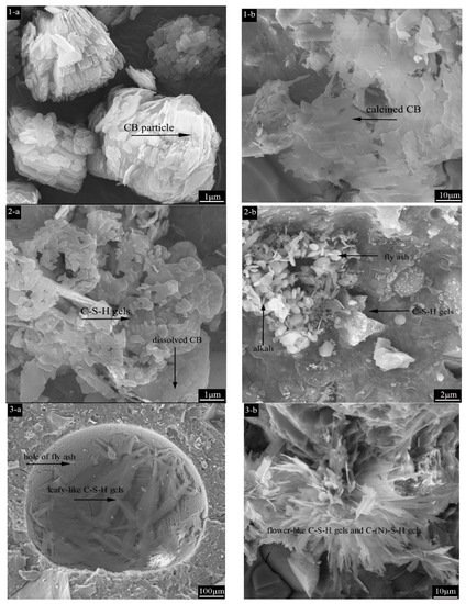 (1-a) CB particles at 20 °C, (1-b) CB after calcination at 750 °C for 2 h. (2-a) Hydrated morphology of CB particles with C-S-H gels at 20 °C, (2-b) Hydrated morphology of CB particles with C-S-H gels after calcination. (3-a) Leaf-like gels in AAC150 sample, (3-b) Flower-like gels in AAC750 sample. (4-a) EDS elemental analysis of the leaf-like gels, (4-b) elemental analysis of the flower-like gels.