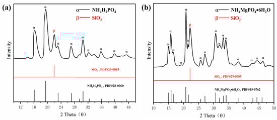 The preparations of ultrafine struvite powder and ultrafine NH4H2PO4 powder were prepared as follows: firstly, the struvite was crushed and refined by a horizontal planetary ball mill; the time and speed were controlled at 40 min and 400 r/min. The ratio of grinding ball, struvite, and absolute ethanol was controlled at 5:1:1. The refined struvite was then dried at room temperature for 5 h. Finally, 5 wt.% of hydrophobic silica was added to the dried sample for secondary ball milling to obtain an ultrafine struvite powder. The preparation of ultrafine NH4H2PO4 powder was the same as the above preparation conditions. Figure 1 shows the XRD spectra of the two synthesized materials. As shown in Figure 1a,b, the crystal peak of silica is identified at 2 theta of 22.03°, and no other new substances are identified on the two spectra, which confirmed that hydrophobic silica is only mixed with two samples and does not react to form new substances. In these cases, the mixed hydrophobic silica gives both samples good fluidity and hydrophobicity to meet fire extinguishing agent requirements.