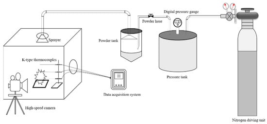 In order to compare the fire extinguishing performance of ultrafine NH4H2PO4 powder and ultrafine struvite powder, a small powder fire extinguishing device was used to carry out local oil basin tests [24,25,26,27]. The small powder fire extinguishing device used in the experiment is composed of three parts: a powder storage pressure device that is fire extinguishing, a temperature measuring device, and a data acquisition system. The schematic diagram of the experimental device is shown in Figure 2. The fuel fire used in the fire extinguishing experiment is a liquid pool fire produced by combining 200 mL of water with 150 mL of n-heptane in a 400 mm × 400 mm × 50 mm oil pan. The oil pan can be placed on iron cube supports of different heights to adjust the distance between the oil surface and the nozzle. The temperature acquisition system consists of three K-type thermocouples with a diameter of 4 mm connected to the data acquisition instrument to collect the flame temperature. The powder pressurizing device consists of a nitrogen bottle, a pressure tank, a powder tank, and a stainless-steel conical nozzle fixed to a stand with adjustable height and direction. The fire extinguishing time of different powders is recorded by an electronic stopwatch. During the fire extinguishing experiment, 50 g fire extinguishing agent were placed in powder cans as a fixed amount for the experiment, and the powder consumption was obtained by weighing the mass difference of the sample before and after the experiment with an electronic balance. In order to stabilize the flame temperature zone, each experiment required pre-burning for 60 s before releasing the sample. Each set of samples was repeated three times to reduce accidental errors.