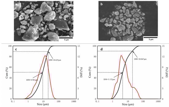 The morphology and particle size of the powder are the key factors affecting its fire-extinguishing effect. It is thought that when 90% of the particles in the powder are less than 20 μm (D90 < 20 μm), the powder achieves ultrafine requirements. As shown in Figure 3a,b, struvite and NH4H2PO4 meet the ultrafine requirements under the same process conditions, but they show different microstructures. Figure 3a shows that the ultrafine NH4H2PO4 powder exists in the form of an irregular prismatic structure, and there is an obvious agglomeration phenomenon in which the large particles are surrounded by small particles. Figure 3b shows that the ultrafine struvite powder exists in a relatively smooth columnar structure. The overall particle size is smaller, the particle size distribution is relatively uniform, and the agglomeration phenomenon is obviously improved. According to Figure 3c,d, the D90 of ultrafine NH4H2PO4 powder and ultrafine struvite powder are 18.625 μm and 20.077 μm, respectively, which reach the ultrafine standard. By comparing the average particle size (D50) of the two samples, it is found that the average particle size of struvite is smaller (D50 = 5.132 μm < 8.961 μm). The results show that struvite particles prepared under the same process conditions have smaller particle sizes and less agglomeration, indicating that struvite is not easily agglomerated in storage and has better dispersion and a faster decomposition rate in the fire, resulting in better fire extinguishing capacity.