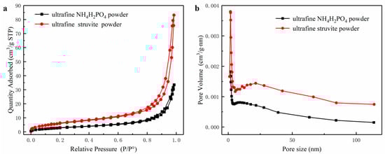 Figure 5a,b show the adsorption-desorption curves and pore size distribution curves of the two powders. The specific surface area (25.72 m2/g) of ultrafine struvite powder is larger than that of ultrafine NH4H2PO4 powder (13.64 m2/g) (see Table 1). This phenomenon is most likely caused by the particle size and particle size distribution of the two samples. As the particle size becomes smaller, the specific surface area becomes larger. According to previous studies [3,4], particles with a large specific surface area capture free radicals in the fire field more easily, and the degree of pyrolysis is more thorough due to the increased contact area with the flame. Therefore, struvite is more suitable for fire extinguishing due to its uniform size distribution and relatively high surface area.