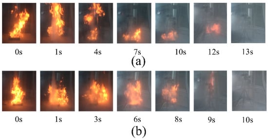 Images of the fire suppression processes of the tests with different samples at 0.2 MPa. (a) ultrafine NH4H2PO4 powder and (b) ultrafine struvite powder.