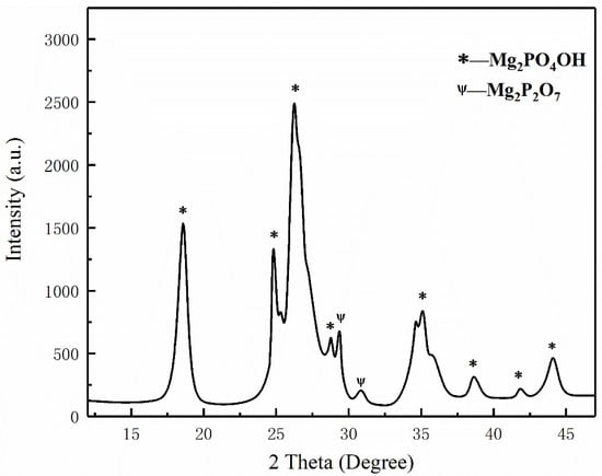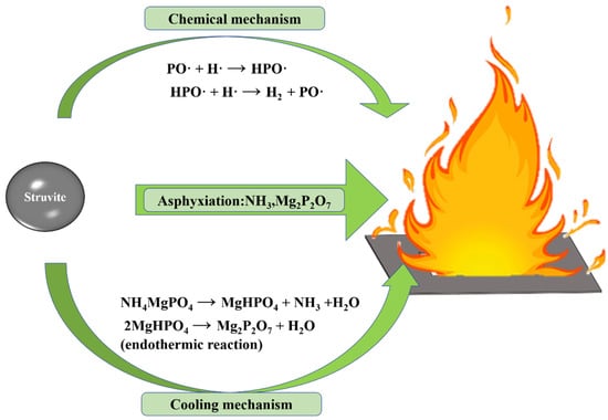 Struvite (chemically bonded phosphate ceramics) releases water and ammonia at high temperatures, which dilutes oxygen and combustible gases in the fire so that the oxygen concentration is lower than the oxygen threshold of combustible gas combustion. In addition, the final product of struvite (Mg2P2O7, heat-resistant ceramics) will form a dense isolation layer [15,19,31], blocking the contact between combustibles and air to achieve physical asphyxiation. Compared with NH4H2PO4, the final pyrolysis product of struvite is magnesium pyrophosphate (pH > 7), which is non-corrosive to metal equipment.