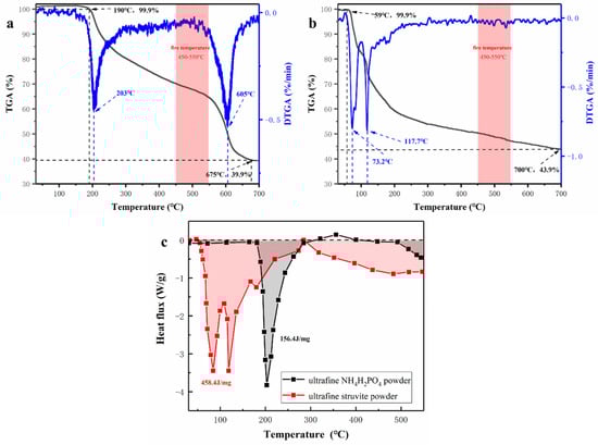 (a) Thermogravimetric (TG) and Derivative thermogravimetric (DTG) curves of NH4H2PO4, (b) Thermogravimetric (TG) and Derivative thermogravimetric (DTG) curves of struvite, (c) Differential scanning calorimetry (DSC) curves of sample powders.