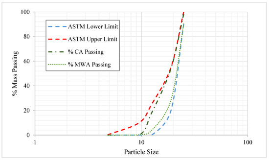The marble waste aggregates (MWA) were obtained from a marble factory and further crushed and sieved to obtain the desired size of marble aggregates equivalent to the standard coarse aggregate size used in mix design [45]. The particle size distribution of MWA and a comparison with the standard coarse aggregate size are presented in Figure 1.
