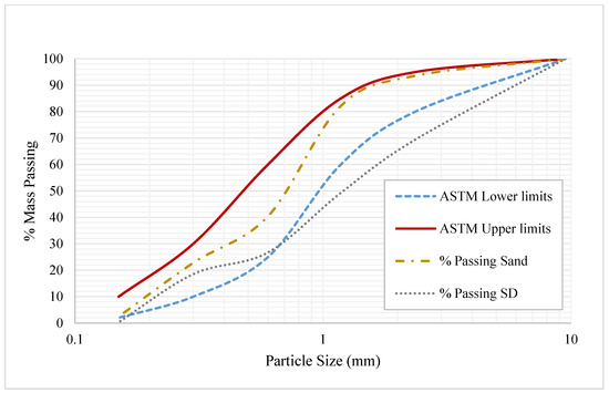 Stone dust (SD) was procured from the aggregate crushing plant, which is the residue left after aggregate production in the crushing plant. The obtained stone dust was used as a replacement for sand in the mix design. The particle size of SD confirmed the standard size of sand, as shown in Figure 2. The water absorption and specific gravity of SD were determined as 1.48 and 2.61, respectively, with a fineness modulus of 3.35.