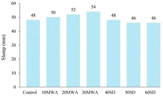 The slump test measures the workability of concrete. The desired slump value for the control specimen was 50 mm. All results were within the range of 50 ± 5 mm (Figure 3). With the addition of MWA, slump increases are attributed to the smooth surface and less absorption of MWA than normally used coarse aggregate. These results were validated by past researchers as well [17]. On the other hand, substation of SD causes decreases in slump value, which indicates that SD has finer particles in contrast to sand.