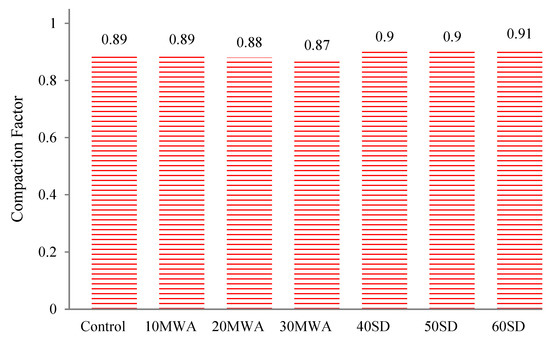 Workability can also be assessed by the compaction factor test, as shown in Figure 4. The desired value for the control specimen was 0.92. All workability test results were within the range of 0.90 ± 0.05, which confirms comparison consistency between the examined properties of the concrete samples. With the addition of marble waste aggregate (MWA), the compaction factor decreases as the ratio rises. This can be attributed to the smooth surface and less absorption of MWA than normally used coarse aggregate. While the inclusion of stone dust (SD), the compaction factor increases as the percentage of SD increases. This can be attributed to finer particles of SD as compared to sand. The results are in close agreement with previous research findings [37].
