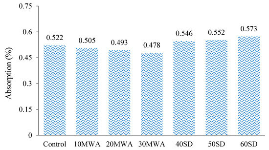 The average absorption percentages (Figure 5) of samples indicated that the absorption of samples containing MWA was less (3.25% to 5.55%) than the control sample, which may be attributed to the more polished surfaces of MWA than the normal aggregate, whereas the absorption of samples containing SD was more (4.6% to 9.77%) than the control sample, which may be attributed to finer particles (exhibiting more surface area) present in SD than the normal sand [64,65].