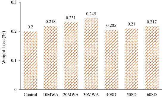ASTM C1898-20 was performed to ascertain the chemical resistance of the concrete specimens under the anticipated service environment. The solutions became ashy after one day of submersion of the samples. There was some grainy appearance after the removal of samples from the acid, and this appearance was rougher in specimens containing MWA as compared to the control sample, whereas the appearance was unchanged in the case of SD samples (Figure 6). These findings may be ascribed to the more reactive nature of MWA with H2SO4 than the normal aggregate and finer particles of SD in the respective samples [64].