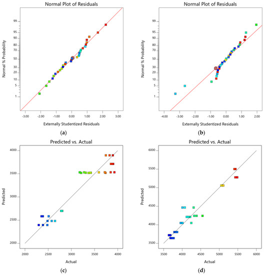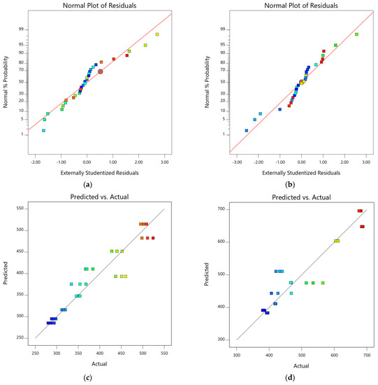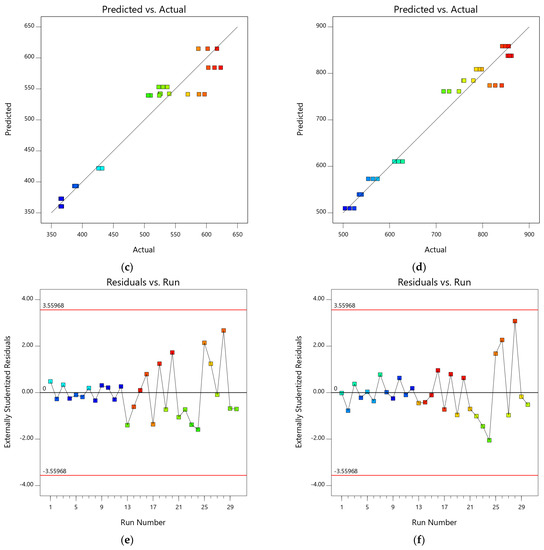 Based on the above coefficients of equations (Table 9), the following prediction equations were generated using generalized Equation (1). The predicted values of the responses in Equations (2)–(7) are in MPa.