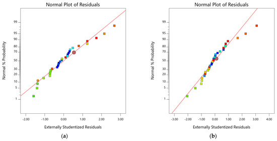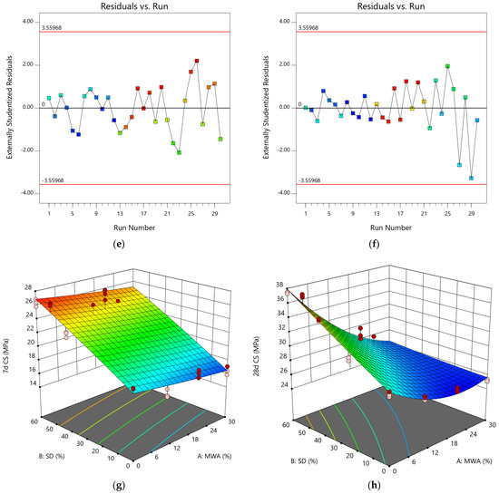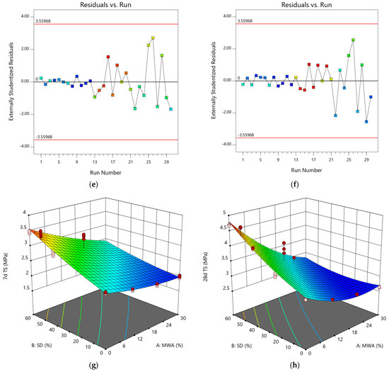 In addition to model validation and fit statistics, the adequacy and normal distribution of data can also be verified graphically by diagnostic plots. The diagnostic plots, such as normal plots of residual, predicted vs. actual plots, and residual vs. run plots, can be used in evaluating the accuracy of regression analysis [66]. The normal plots of residual for both 7-day and 28-day compressive strength are shown in Figure 7a,b. It can be observed from the plots that the relationship between the normal percentage of probability and the extremely studentized residual is satisfactory because almost all the points are closely located along the straight line for both responses. It indicates that the residual values, which are the difference between experimental and predicted responses, exhibit a normal distribution [67]. The relationship between predicted and actual data points for 7-day and 28-day compressive strength is shown in Figure 7c,d. The distribution of data points is spread relatively close to the equality line, which indicates satisfactory fitting precision of the models and adequate agreement between experimental and predicted results. Similarly, Figure 7e,f represent the plot of residuals with respect to predicted responses. The data scattering within the top and bottom red boundaries and the sinusoidal distribution of data points corresponding to run number indicate acceptable accuracy of model predictability. These diagnostic plots validate that the developed compressive strength models are applicable to predict the 7-day and 28-day compressive models corresponding to MWA and SD content [60,61,62]. Moreover, 3D graphs (Figure 7g,h) can also be used to establish a relationship between factors (SD and MWA) and responses (CS). Compressive strength at 7 days and 28 days of curing showed a decline with increasing MWA substitution. However, the substitution of SD showed an increase in compressive strength.
