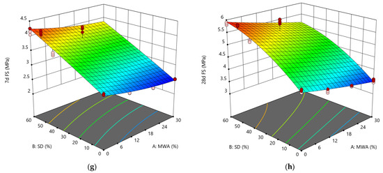 In addition to model validation and fit statistics, the adequacy and normal distribution of data can also be verified graphically by diagnostic plots. The diagnostic plots, such as normal plots of residual, predicted vs. actual plots, and residual vs. run plots, can be used in evaluating the accuracy of regression analysis [66]. The normal plots of residual for both 7-day and 28-day flexural strength are shown in Figure 8a,b. It can be observed from the plots that the relationship between the normal percentage of probability and the extremely studentized residual is satisfactory because almost all the points are closely located along the straight line for both responses. It indicates that the residual values, which are the difference between experimental and predicted responses, exhibit a normal distribution [67]. The relationship between predicted and actual data points of 7-day and 28-day flexural strength is shown in Figure 8c,d. The distribution of data points is spread relatively close to the equality line, which indicates satisfactory fitting precision of the models and adequate agreement between experimental and predicted results. Similarly, Figure 8e,f represent the plot of residuals with respect to predicted responses. The data scattering within the top and bottom red boundaries and the sinusoidal distribution of data points corresponding to run number indicate acceptable accuracy of model predictability. These diagnostic plots validate that the developed flexural strength models are applicable to predict the 7-day and 28-day flexural models corresponding to MWA and SD content [60,61,62]. Moreover, 3D graphs (Figure 8g,h) can also be used to establish a relationship between factors (SD and MWA) and responses (FS). Flexural strength at 7 days and 28 days of curing showed a decline with increasing MWA substation. However, the substitution of SD showed an increase in flexural strength.
