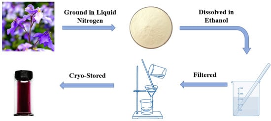 The detailed formulating procedures are as follows. Fresh F. orchid flowers from the university campus were collected. The petals were then separated and refrigerated at 4 °C (most-widely adopted temperature for the preservation of organic compounds [41,42]). Next, petals were rinsed with de-ionized water, mixed with liquid nitrogen in a mortar, and ground into powder with a pestle. Subsequently, 50 g of frozen powder was taken and dissolved in 100 mL of ethanol. The mix was settled for no less than 24 h to guarantee full dissolution. Finally, the ethanol solution was filtered and condensed under reduced pressure to complete the formulation process (see Figure 1). The F. orchid indicator was stored in a sealed dark glass bottle. Note that both fresh and aged (cryopreserved at approximately −5 °C for 3 months) pH indicators were prepared in the present study, which promises examination of the indicator’s durability.