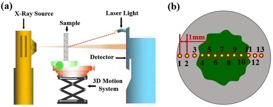 The X-ray scanner used in this study was produced by Aoshi Electronic Technology Co., Ltd. in Dongguan City, Guangdong Province, China. The scanning parameters were set still during multiple scans (working voltage: 70 kV; working current: 0.6 mA; filter quality: 0.5 mm aluminum sheet). Laser light was used to geometrically align the position of the specimen from multiple scans, and a 3D moving table was adopted to control the motion of the tested sample (see Figure 2a). For each neutralized sample, 13 points horizontally from left to right, passing through the center of the scanned sample, were selected as the testing points. The horizontal distance between adjacent points was 1 mm, and the distance from point 1 to the left corner of the tested specimen was set as 1 mm (see Figure 2b).