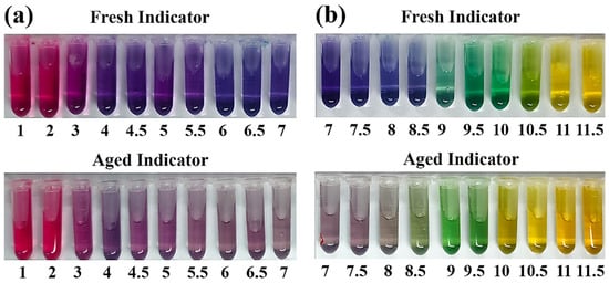 Figure 3. Discoloring behavior of fresh and aged F. orchid indicators exposed to pH ranges of (a) 1.0 to 7.0 and (b) 7.0 to 11.5.