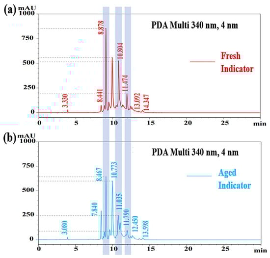 Figure 5 shows the chromatograms of fresh and aged F. orchid indicators. The chromatograms were obtained from high-performance liquid chromatography (HPLC), which was essential in present study. This was because HPLC could help balance the concentration of the new developed indicator, which was achieved through holding the height of the 10 min peak at 550 mAU. As shown in Figure 4, even after three months of cryopreservation, the height of the 10 min peak remained almost unchanged, which verified that the adopted peak was suitable as the concentration calibrator. In addition, chromatograms obtained from HPLC could also be used to evaluate the stability of F. orchid indicator. Although each peak in both Figure 5a,b was related to each other, the peak heights of anthocyanins (marked by gray bars) were significantly reduced after three months of cryopreservation. The result evidenced the degradation of F. orchid indicator, which complied with the discoloring behavior in Figure 3.