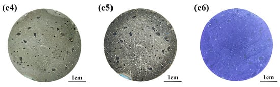 Cross-sections of partly carbonated, leached, and sulfate-attacked paste specimens were pretreated (see Section 2.2) and sprayed with fresh F. orchid indicator, phenolphthalein, malachite green, indigo carmine, and thymolphthalein. The initial cross-sections of neutralized specimens before spraying are given in Figure 6(a1–c1). Apparently, the carbonated and sulfate-attacked areas were overall invisible without spraying, but the partly leached area could be discerned already. The discernable leaching front without spraying was reasonable, as calcium-bearing materials were drastically lost during leaching, and the microstructure of the leached area, therefore, was significantly coarsened [46,47]. For the partly carbonated or sulfate-attacked specimen, the change in microstructure was less significant, so the difference between the carbonated/sulfate-attacked and non-carbonated/non-sulfate-attacked area was less recognizable [48].