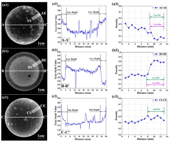 Partly neutralized specimens were further scanned with CT, based on which the reliability of F. orchid indicator was verified. Figure 7(a1–c1) present the typical cross-sections rendered from the partly carbonated, leached, and sulfate-attacked specimen, respectively. Note that each image in Figure 7 was aligned with the related image in Figure 6, and both images can be drawn directly for comparison.