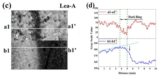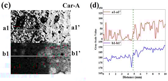 Figure 8. Partly carbonated specimen. (a) Cross-section sprayed with F. orchid indicator; (b) magnified local image of A and related CT image; (c) Binarized image of (b); (d) 1D distribution of grayscale value along a1-a1′ and b1-b1′ in (c).