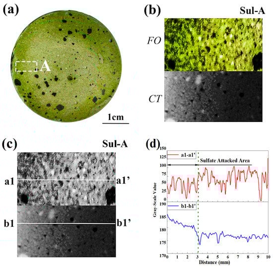 Figure 10. Partly sulfate-attacked specimen. (a) Cross-section sprayed with F. orchid indicator; (b) magnified local image of A and related CT image; (c) binarized image of (b); (d) 1D distribution of grayscale value along a1-a1′ and b1-b1′ in (c).