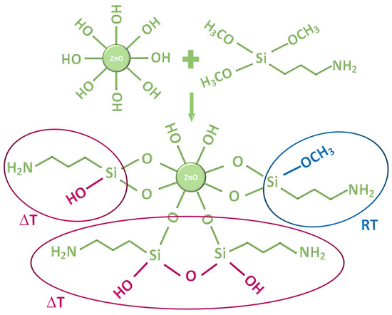 As for the mechanism, in their study on ZnO silanization via ZnO-APTES interaction, Nicolay et al. [77] proposed that the condensation occurs between the surface Zn(OH)2 layer covering the ZnO particle and the alkoxy moiety of the APTES molecule. However, we hypothesize that the condensation pathways may be different depending on the reaction temperature. At a higher temperature (i.e., the temperature of the reactions carried out under reflux), hydrolysis of the methoxy moiety may occur with consequent hydroxylation of the silane. Water elimination from adjacent hydroxyls leads to a further Si-O-Si network. When silanization reactions are carried out at RT, as is the case for G-APTMS@ZnO, the silane hydroxylation occurs to a lesser extent, with a consequently lower degree of Si-O-Si network and a larger amount of methoxy moieties on the coated sample. This is in line with the observed sharp intensity at 829 cm−1 relating to the methoxy moiety and with the relatively low intensity of the Si-O-Si band at 1000 cm−1, for the G-APTMS@ZnO sample. The products of the condensation reactions are sketched in Figure 3.