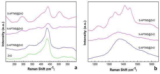 Raman spectra of ZnO and the coated samples N-APTMS@ZnO, G-APTMS@ZnO, and S-APTMS@ZnO. Panel (a) 200–600 cm−1, panel (b) 1100–1700 cm−1.