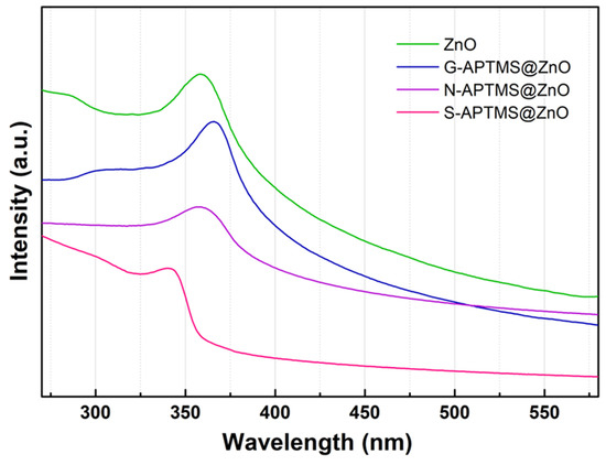 The UV-visible spectra of the synthesized samples in water dispersions are displayed in Figure 6. They are all characterized by a main excitonic peak in the 300–400 nm range. The absorption peak of ZnO is centered at 358 nm and is compatible with hexagonal wurtzite [87]. G-APTMS@ZnO has a main peak at 366 nm, N-APTMS@ZnO at 357 nm, and S-APTMS@ZnO at 340 nm.