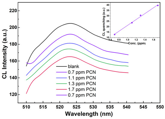 Chemiluminescence spectra of G-APTMS@ZnO as a function of penconazole (PNC) concentration. The peak intensity variation is reported in the inset as a function of the concentration, indicating a good linear response.