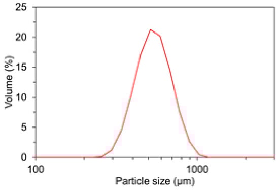 The phase compositions of the cement estimated as per the Bogue calculation were 60.65% C3S, 10.72% C2S, 9.22% C3A, and 8.82% C4AF. Standard sand with a specific gravity of 2.65, fineness modulus of 2.87, the absorptivity of 1.02%, and SiO2 content of 98.4% was used as a fine aggregate. The median diameter (D50) was measured to be 533 mm based on the particle size analysis. Figure 1 presents the particle size distribution of the standard sand used.