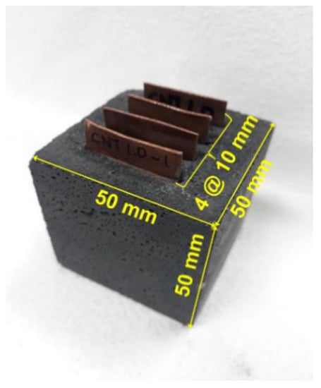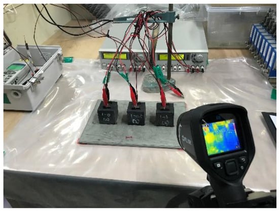 Cube specimens (50 mm × 50 mm × 50 mm) embedded with two 25-mm spaced electrodes were fabricated using the identical mixture proportions used in the electrical resistivity test. The insertion depth of the electrodes was 40 mm. A DC power supply (OPE-503QI; ODA Technology Inc., Incheon, Republic of Korea) was used to apply an electrical potential; the maximum output voltage and current of the power supply were 50V and 3A, respectively (150 VA). At 28 days, an electrical potential of 8V DC was applied between the two electrodes embedded to induce the Joule heating effect; for those whose temperature rise was insignificant under 8V DC (i.e., CNT0-CF0, CNT0-CF0.5, CNT0-CF1, and CNT0.5-CF0), additional testing was performed under an electrical potential of 50V DC. Simultaneously, the Joule heating-driven inner temperature rise and the surface temperature changes were measured using a T-type thermocouple installed at the core of the specimen and an infrared thermal analyzer (FLIR E8; Teledyne FLIR, Wilsonville, OR, USA), respectively, as shown in Figure 9.
