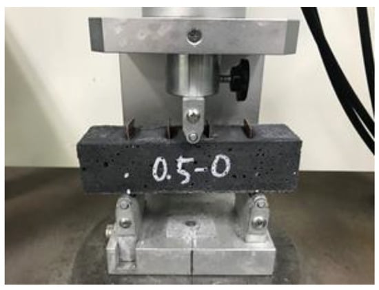To assess the CF effect of crack width on the electrical resistivity of cementitious composites randomly distributed with chopped CF and CNT along the crack interface, 40 mm × 40 mm × 160 mm prismatic specimens were fabricated with two different levels of CNT (0.5 and 1.0%) and three different levels of CF (0, 0.5, and 1.0%), i.e., CNT0.5-CF0, CNT1-CF0, CNT1-CF0.5, and CNT1-CF1. To measure the electrical resistivity across a crack via the 4-probe method, four 25 mm-wide electrodes were situated at a constant spacing of 30 mm with an insertion depth of 30 mm. After 72 h of moist curing, each specimen was loaded at a very low load rate of 10 N/s to induce a crack at the mid-span of the specimen (between the two electrodes in the middle), as shown in Figure 7.