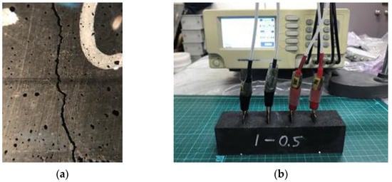 Electrical resistivity measurements for different apparent crack widths: (a) crack width control using a crack-measuring microscope; and (b) electrical resistivity measurement via the 4-probe method.