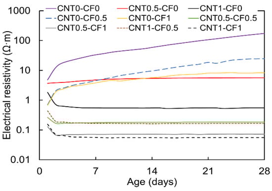 Figure 10 presents how the CNT and CF additions affect the electrical resistivity over time.