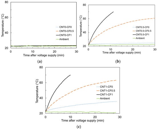 This is because Joule’s law of heating is given by the product of its resistance and the square of the current; thus, if the electrical resistance is reduced by a factor of 1/n, the power of heating becomes n times higher under a constant voltage [12,32]. It is apparent from Figure 11a that the specimens with CF alone showed a negligible heating performance because they had approximately 15 to 310 times higher electrical resistivity than that of CNT1-CF1 (the specimen with the lowest electrical resistivity).