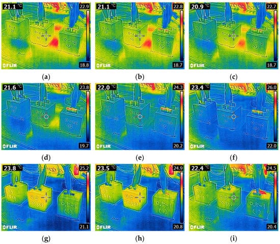 Thermal images of 0% CNT series specimens (CNT0-CF0, CNT0-CF0.5, and CNT0-CF1, respectively, from the left) taken at: (a) 0 s, (b) 45 s, (c) 90 s, (d) 135 s, (e) 180 s, (f) 225 s, (g) 270 s, (h) 315 s, and (i) 360 s upon 8V DC supply.
